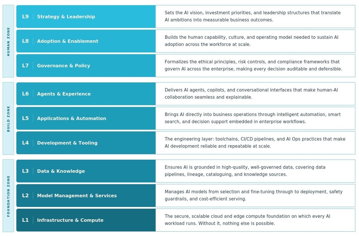 It is twelve multiple-choice questions and takes five minutes to complete. It is based on our SoT AI Enterprise Reference Model, a nine-layer framework that maps every dimension of AI capability an organization needs to deliver sustained business value.