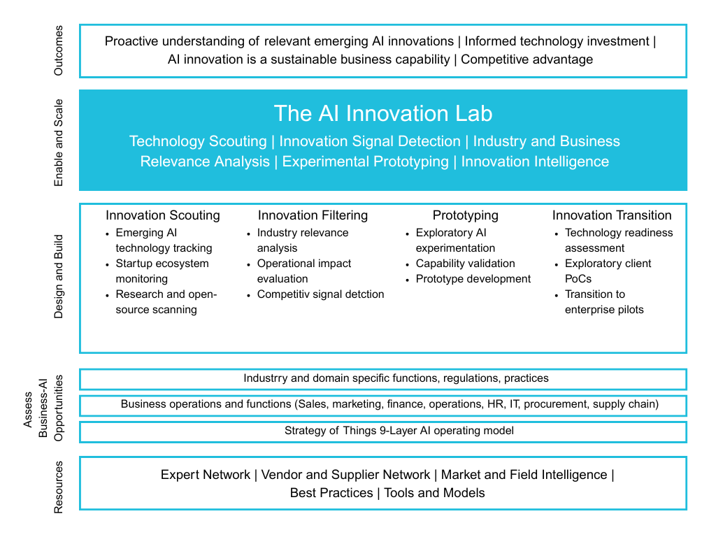 Our work is grounded in the Strategy of Things 9-Layer Enterprise AI Reference Model, which maps the full organizational surface area AI touches, from infrastructure and data architecture to governance, risk, adoption, and executive decision-making. We use this foundation to identify and discover emerging innovations and technologies.